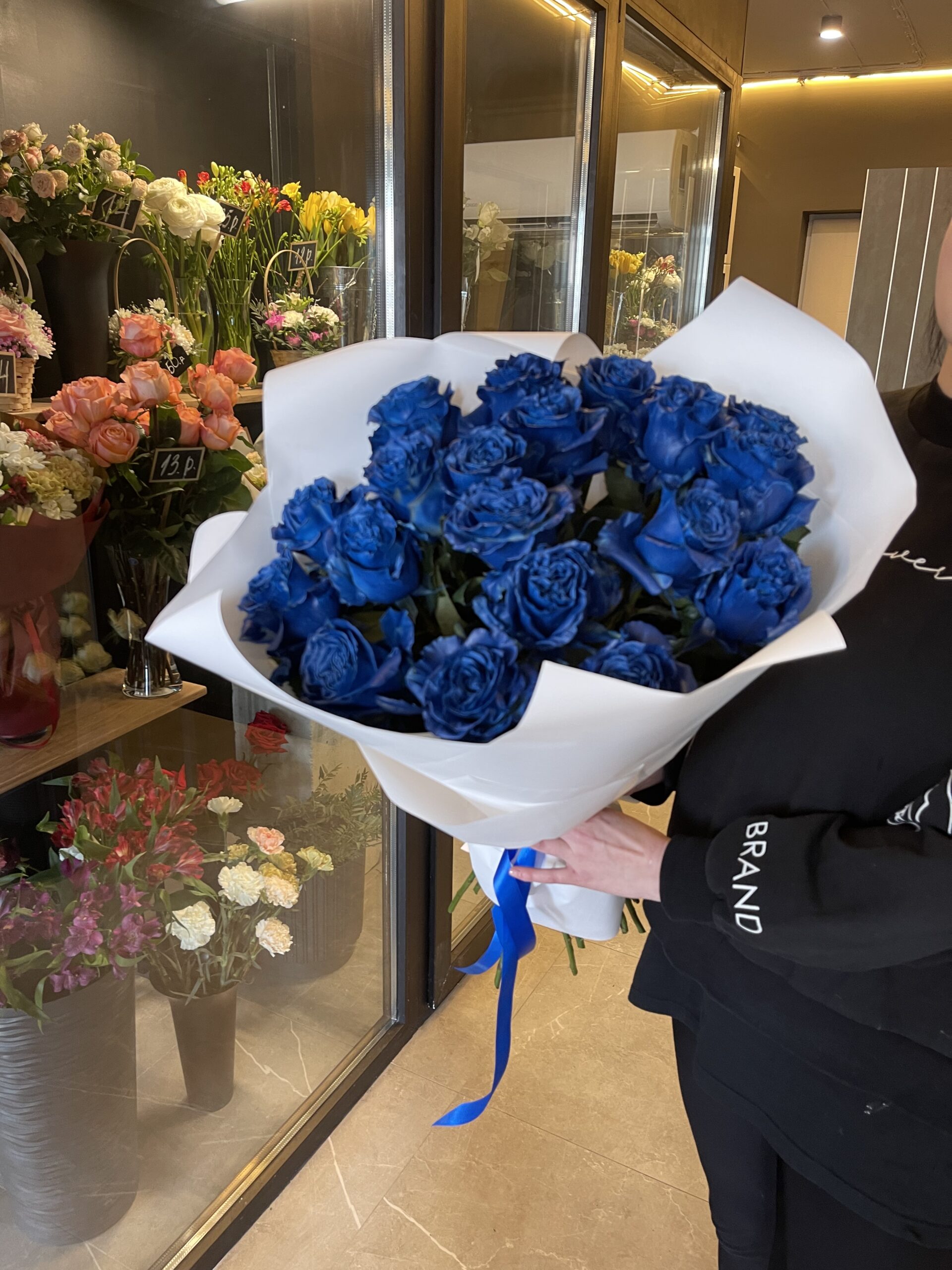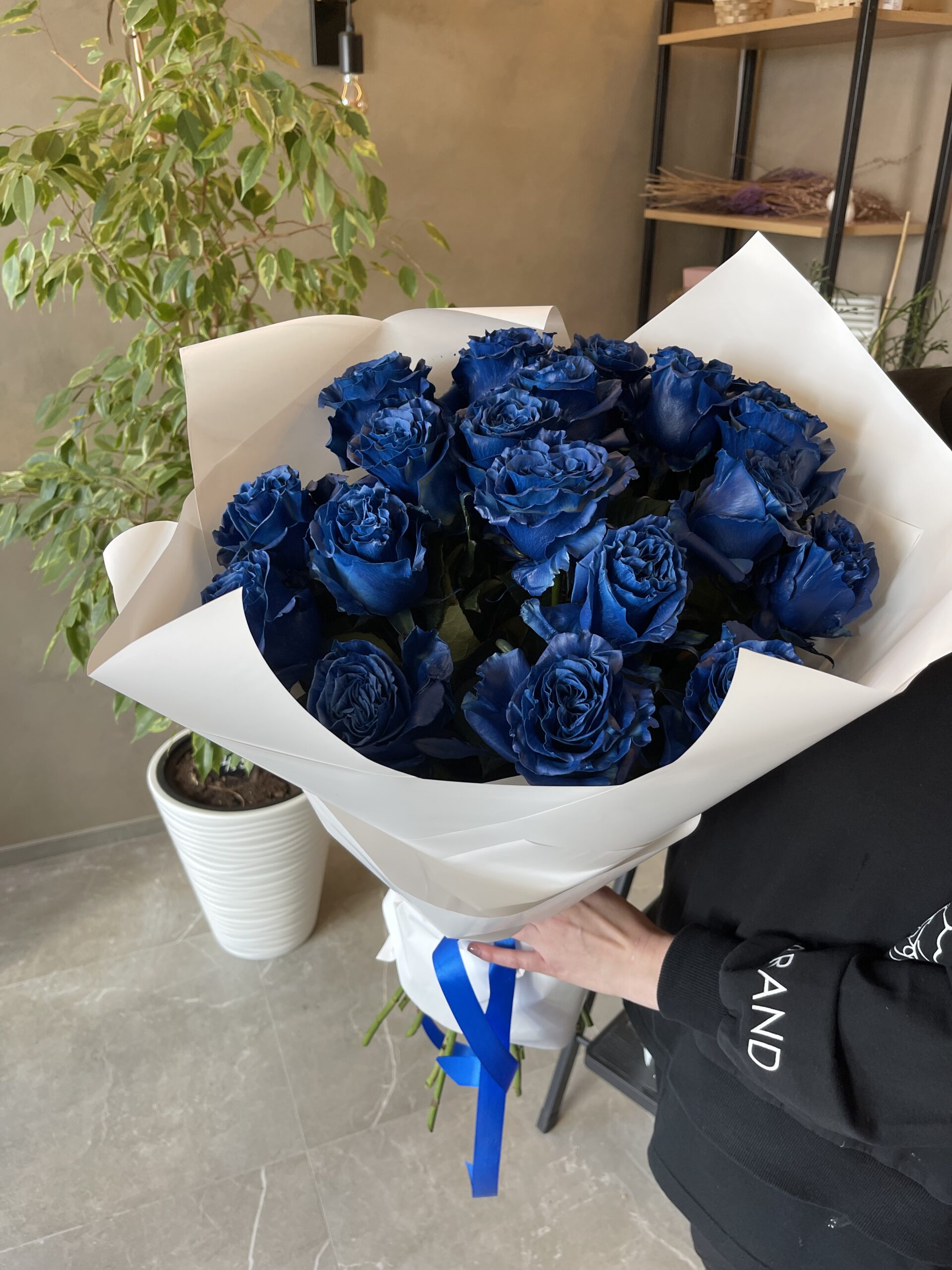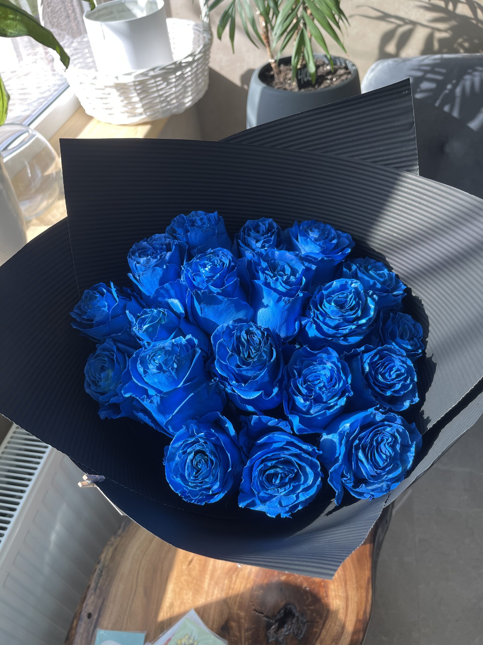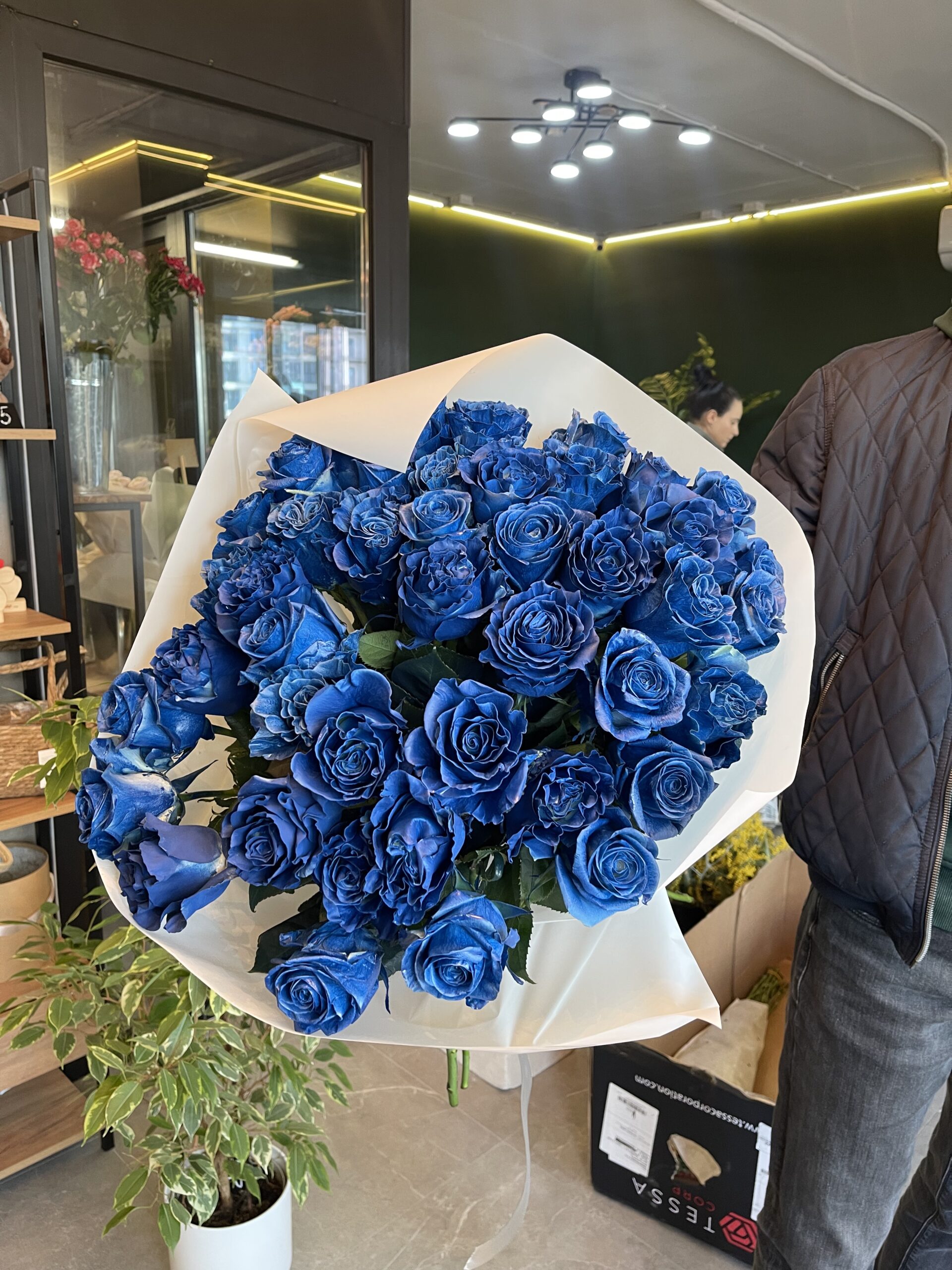 Синие розы символизируют таинственность и загадку, неприкосновенность и недоступность . Или просто «цвет настроения синий»!) Наши флористы непременно позаботятся о том, чтобы букет был красиво оформлен в подходящую упаковку. В данном случае, так как букет предназначался девушке, это было нежная молочная упаковка с кантом. Что прекрасно подчеркнуло цвет букета. Если же букет будет предназначаться мужчине — то можно подобрать что-то более брутальное и тёмное.