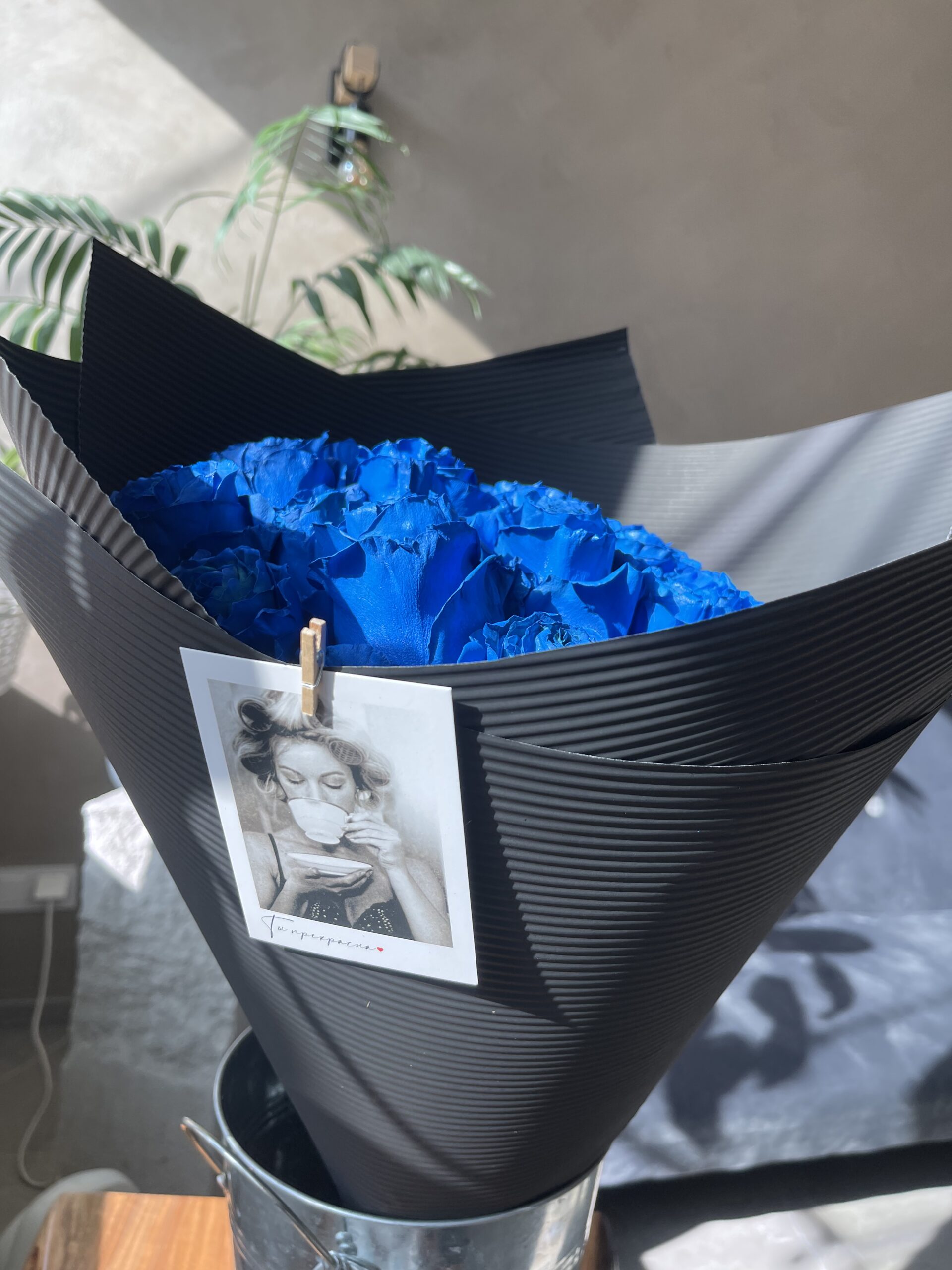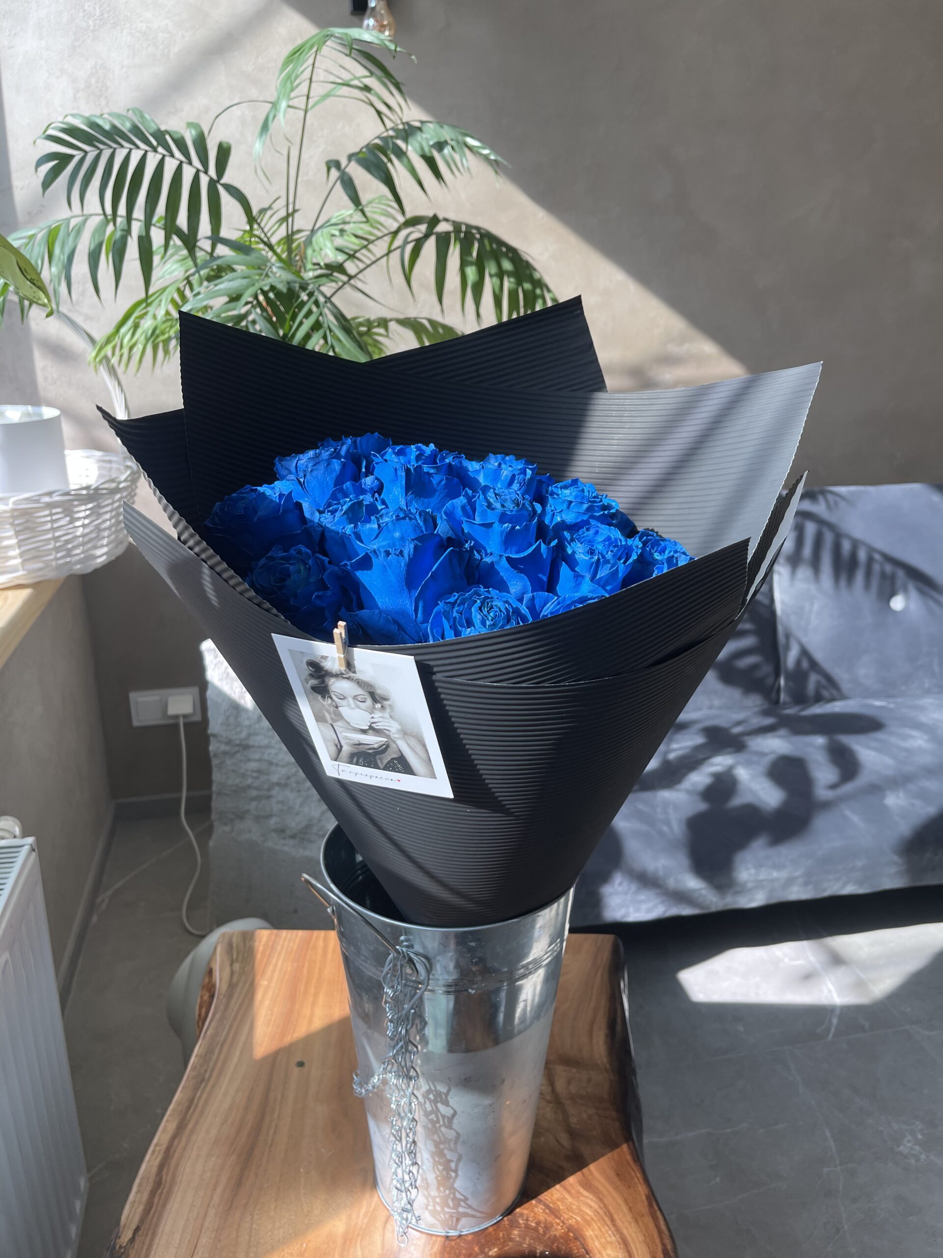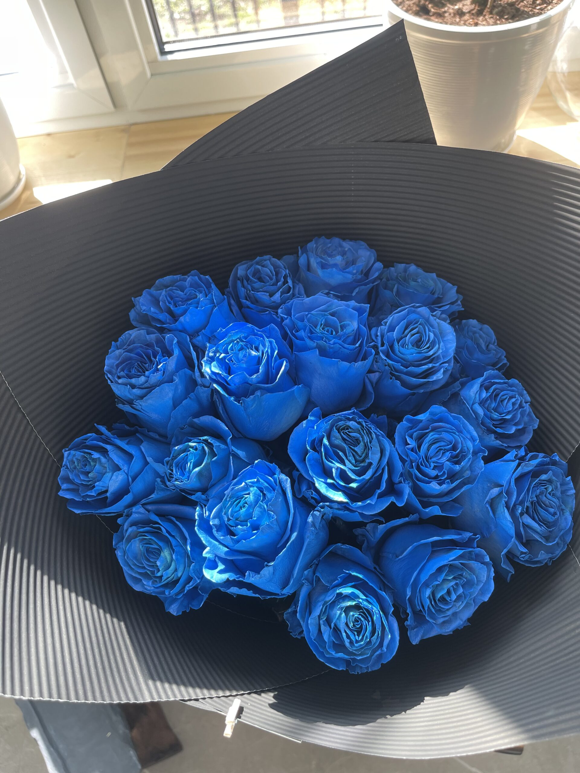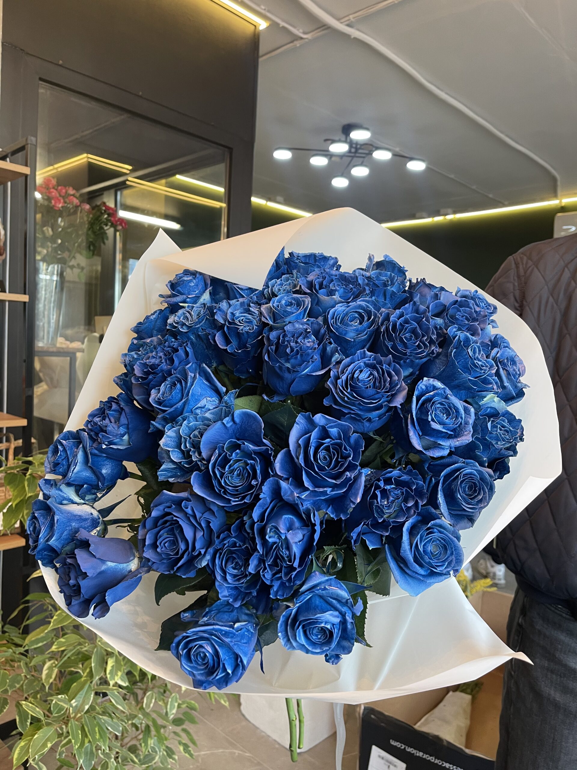 Синие розы символизируют таинственность и загадку, неприкосновенность и недоступность . Или просто «цвет настроения синий»!) Наши флористы непременно позаботятся о том, чтобы букет был красиво оформлен в подходящую упаковку. В данном случае, так как букет предназначался девушке, это было нежная молочная упаковка с кантом. Что прекрасно подчеркнуло цвет букета. Если же букет будет предназначаться мужчине — то можно подобрать что-то более брутальное и тёмное.